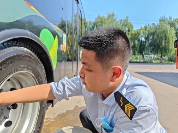 “衣服都濕透了,別弄了,先歇歇吧?!薄皼]事,我把衛(wèi)生弄好了就去。”......眼前這個(gè)小伙是603路的張?zhí)祧?,趁著休停時(shí)間,他一邊用布擦拭著輪轂,一邊用手擦拭臉上的汗珠。忙完后,發(fā)現(xiàn)發(fā)車時(shí)間已到,他立即回到駕駛室,等待乘客的到來和發(fā)班指令,沒來得及喝上一口水。