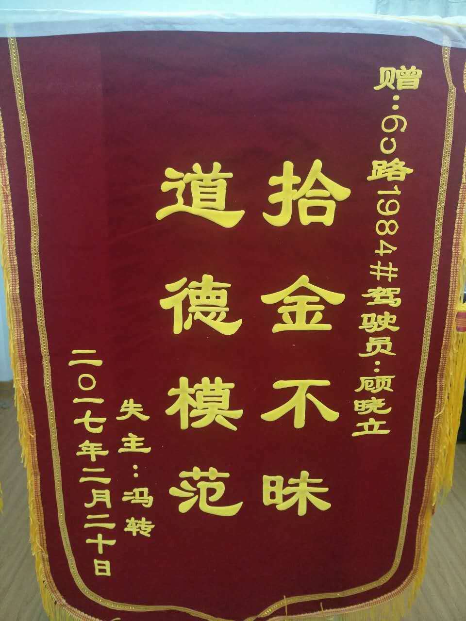 顧曉立拾金不昧乘客馮先生送錦旗感謝