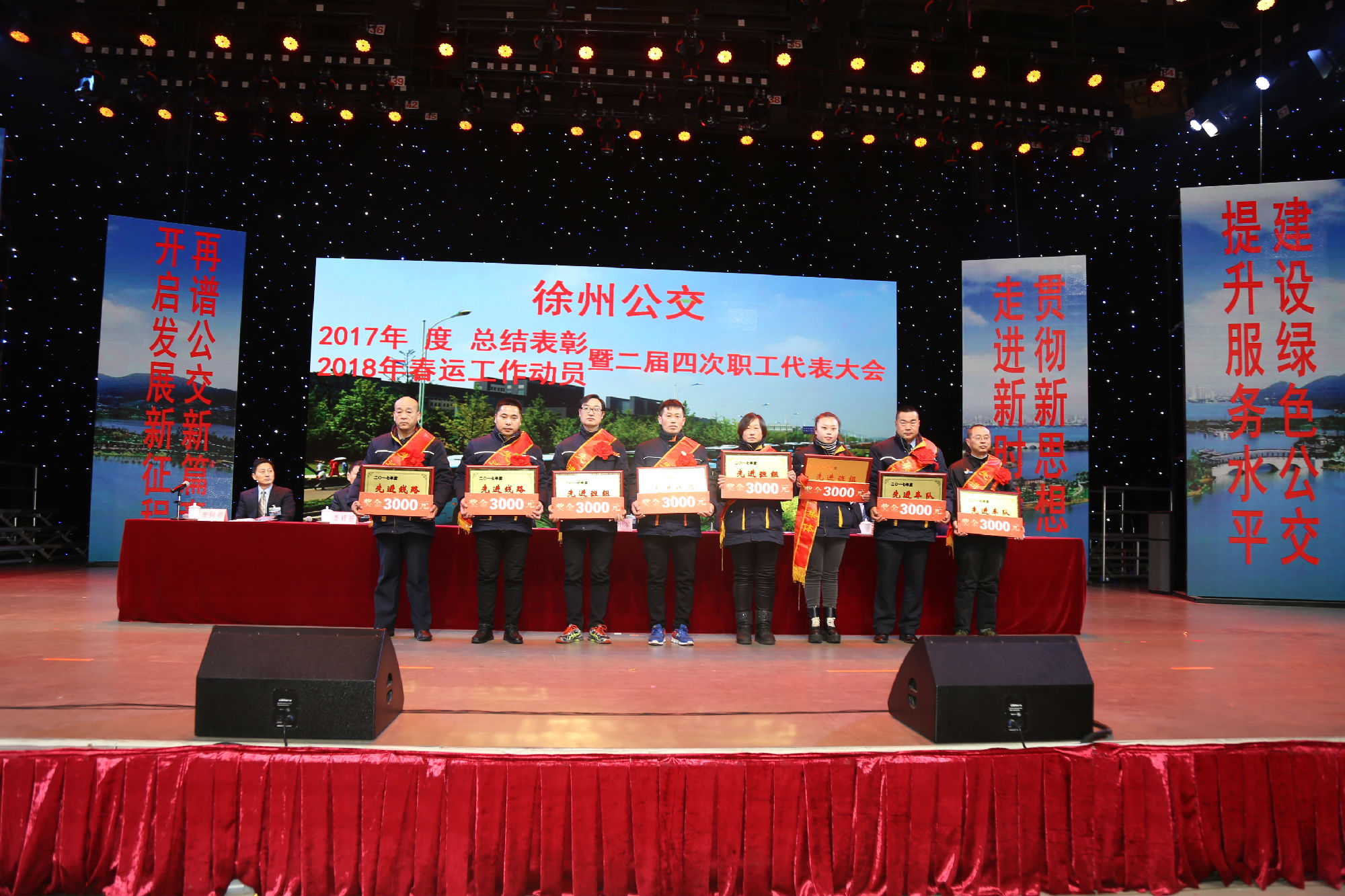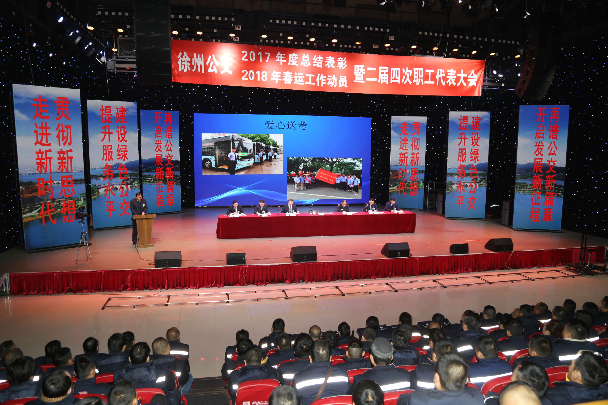 大會在莊嚴的國歌聲中拉開序幕。公司董事長、總經(jīng)理杜紅軍首先作經(jīng)理工作報告,對2017年“改革創(chuàng)新年”工作進行了全面總結(jié):一、實施“同城同價”,優(yōu)化運營管理,實現(xiàn)服務(wù)水平新突破。連續(xù)第五年面向全市征集線路線網(wǎng)優(yōu)化意見近3000條,據(jù)此新辟優(yōu)化線路29條。二、深化資源共享,在互聯(lián)網(wǎng)+企業(yè)管理上譜寫新藍圖。繼續(xù)深化集中維修,推行集中例檢。論證實施支付寶、微信、銀行卡閃付等智能化移動支付方式。三、深化文明創(chuàng)建,打造優(yōu)秀公交,服務(wù)民生出行贏得新口碑。在國檢、省檢中未失一分,圓滿完成創(chuàng)建驗收任務(wù)。投訴總數(shù)和有責投訴同比實現(xiàn)“雙下降”。乘客表揚同比上升近20%。公司在2016年行風熱線上線單位滿意度評議投票中名列榜首。率先打造公交行業(yè)禮讓斑馬線嶄新形象,圓滿完成公交反恐防暴工作。四、著力綜合管理,聚合內(nèi)生動能,增強企業(yè)發(fā)展新優(yōu)勢。重新修訂2012版管理制度匯編和新版《徐州公交獎懲條例》。五、踐行十九大精神,推進和諧發(fā)展,開創(chuàng)黨群工作新面貌。接著,杜總分析了工作中存在的問題,提出下步工作重點。一、建設(shè)現(xiàn)代化公交,提升經(jīng)營管理水平,保障企業(yè)良性有序運行;二、踐行集約共享理念,深化科技應(yīng)用,開創(chuàng)公交事業(yè)發(fā)展新局面;三、建設(shè)平安公交,提升服務(wù)口碑,展示文明公交新形象;四、踐行十九大精神,構(gòu)建和諧公交,開啟黨群工作新面貌。